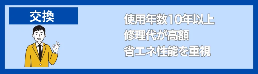 | ・最短30分で駆けつけ ・今日中の交換実績多数 ・緊急トラブルに強い | ・割引最大92%オフ ・写真見積もりで簡単 ・追加費用の不安が少ない | ・長期保証の安心感 ・修理回数制限なし ・商品+工事10年保証 | |